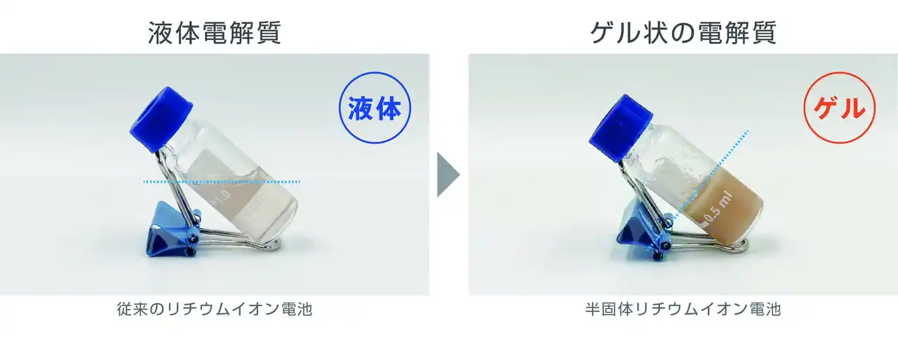 従来の電池は、電池に含まれる電解液内でリチウムイオンが正極と負極の間を移動しています。この度、製品に採用した半固体電池は、電解質を従来の液体からゲル状に変更しています。これにより可燃性成分の揮発が抑えられ、ガスが放出されにくくなるため、安全性が向上します。また、電解質以外の素材にも安全性の高い素材や加工を施すことで、総合的に安全性を高めています。 |