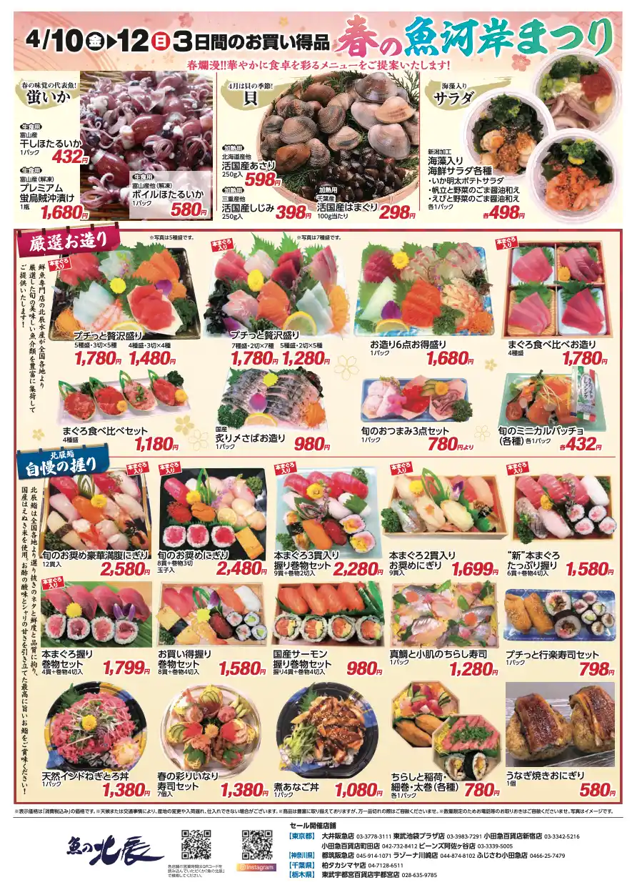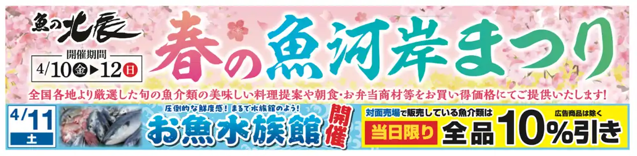 | 水産エンターテイメントカンパニーの株式会社北辰水産は、より多くの方に魚を楽しんで食べていただくため、2026年4月10日(金)から12日(日)までの3日間、全店共通企画「春の魚河岸祭り」を開催いたします。あわせて4月11日(土)には、実際に魚を展示し、まるで水族館かのような演出をする「お魚水族館(R)️」とも実施。当日は対面売場の魚介類が全品10%引きとなる特別企画もご用意しています。春の代表魚である蛍イカや旬の貝類をはじめ、食卓を彩る豊富なラインナップを取り揃え、魚の魅力を五感で楽しめる機会をお届けします。この機会にぜひお試しください。 | |||