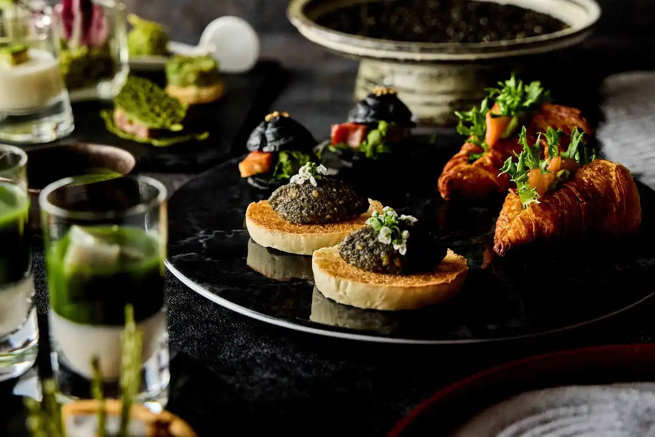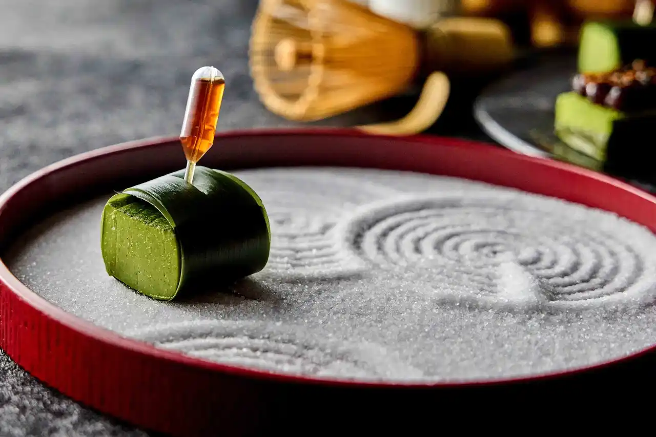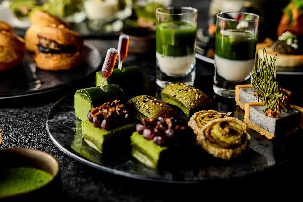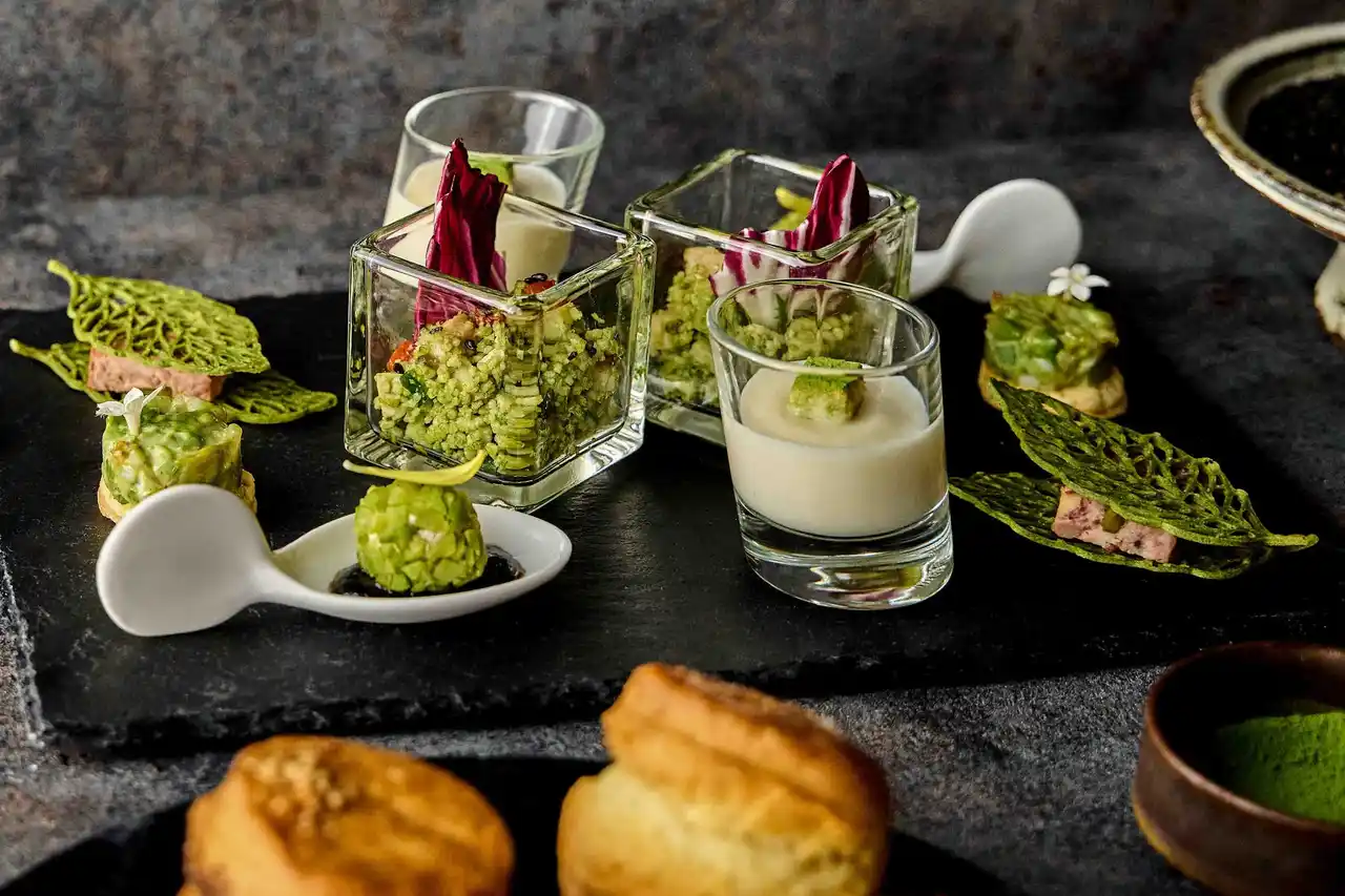抹茶のチュイルでパテドカンパーニュをサンドした一品をはじめ、抹茶風味のマヨネーズでやさしいコクを引き出したシーフードとアボカドの抹茶タルタル、さらにワサビのアクセントを添えた豆と黒胡麻チーズのボンボンなど、ひと口ごとに抹茶の香りと多彩な味わいの重なりをお楽しみいただけます。 |