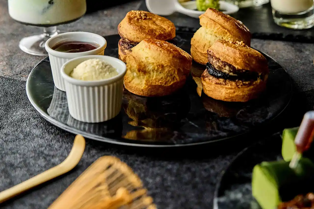 <スタンド下段>ゲランド塩スコーン / 黒胡麻あずきスコーン /(コンディメント)みたらし餡 / クロテッドクリーム |