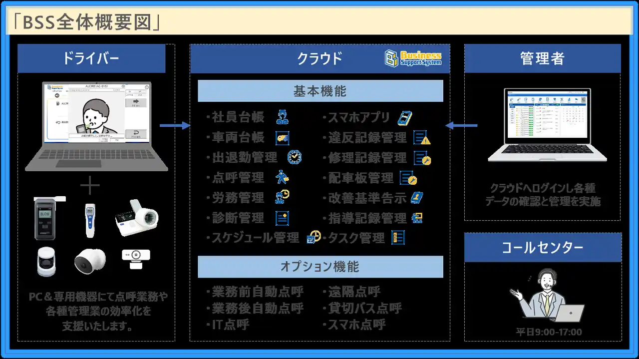 本展示会では,BSSで実施可能な以下の点呼機能を中心にご紹介します。 |
