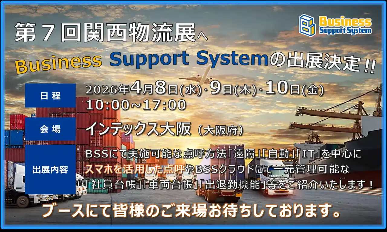 運送事業者様向け点呼システム「Business Support System」をインテックス大阪開催の「関西物流展(4月8月~4月10日)」へ出展することが決定いたしました。