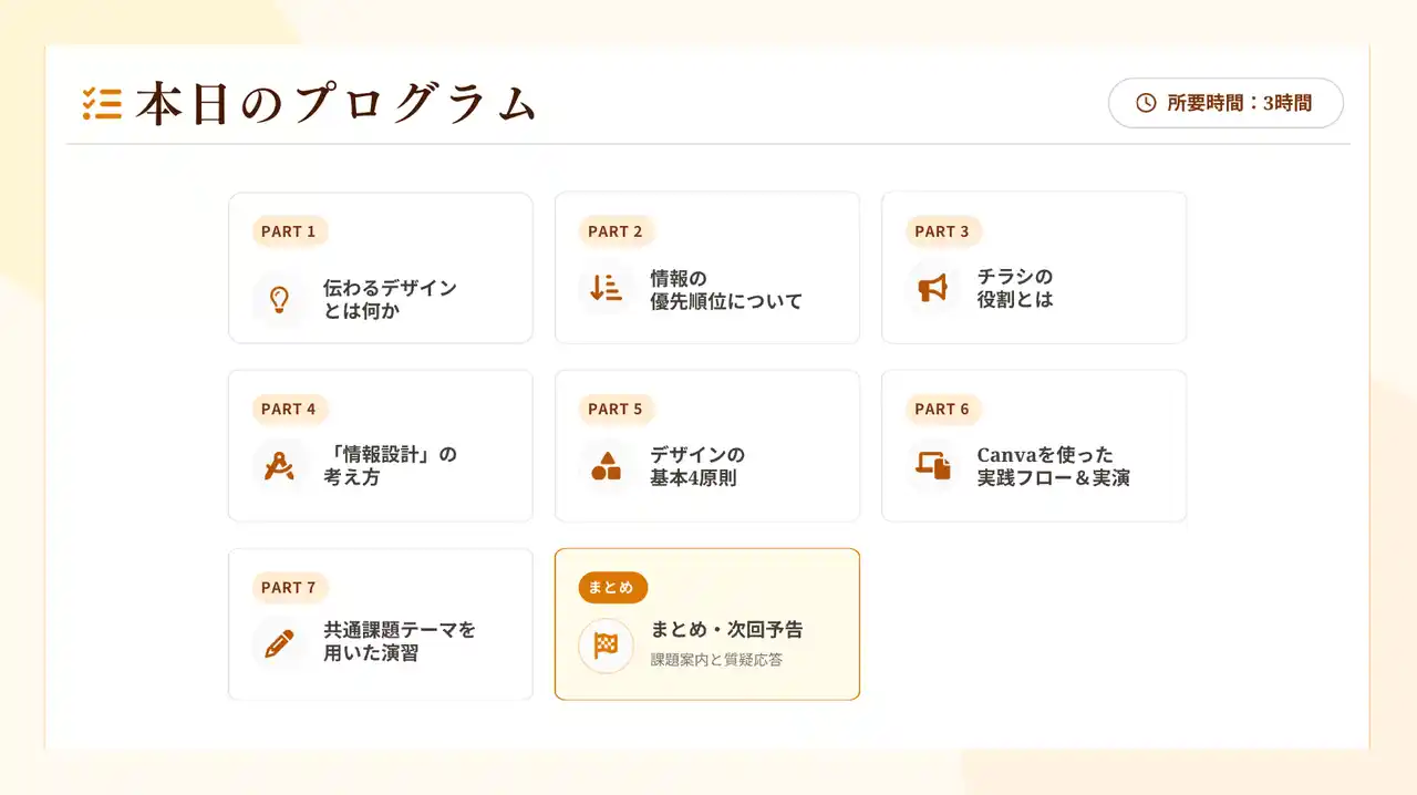 「伝わるデザイン」の考え方を中心に、目的・対象・行動の整理や情報設計の基本を学びました。 また、実演・演習を交えながら、広報物の設計から制作までの流れを理解し、実務への活用イメージを深めました。 |