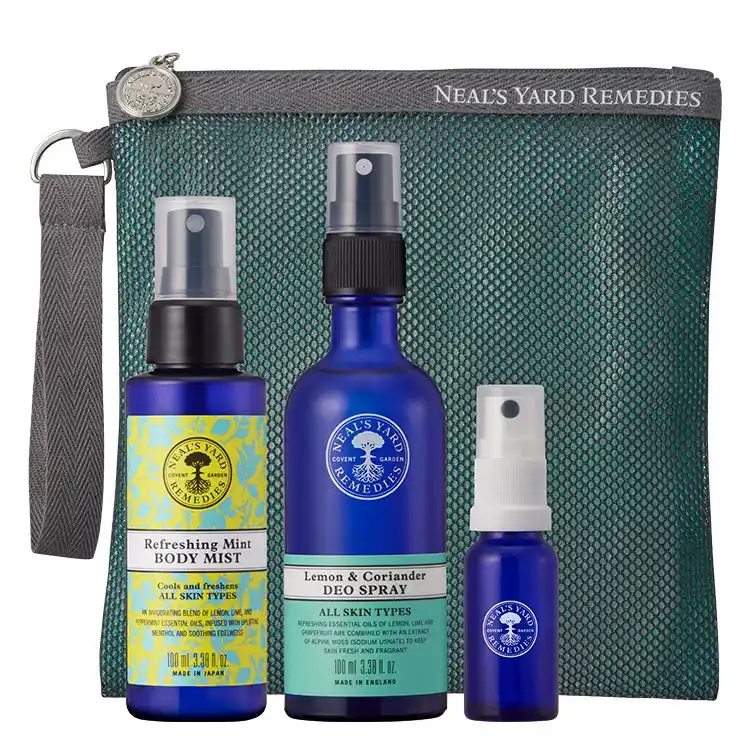 シーンに合わせて使い分けるのはもちろん、デオスプレーの上からボディミストを重ねることで、爽快感がさがさらに高まります。昨年好評だった併用使いを、セットでご用意しました。ニールズヤードのロゴ入りメッシュポーチと、持ち運びに便利なミニスプレーボトル付きで、夏のお出かけにもぴったりな日本限定セットです。 |