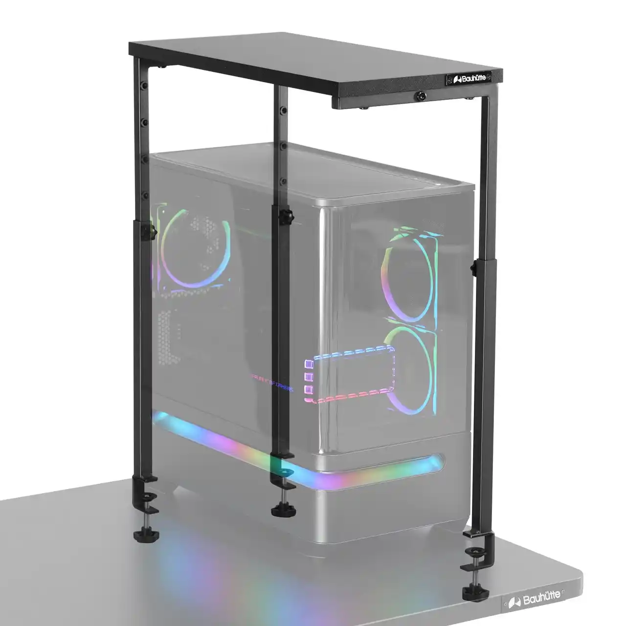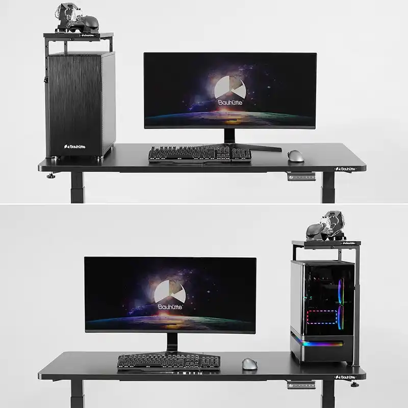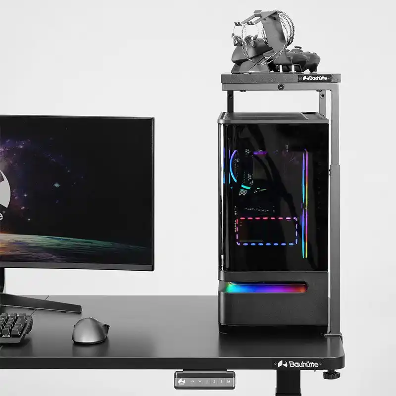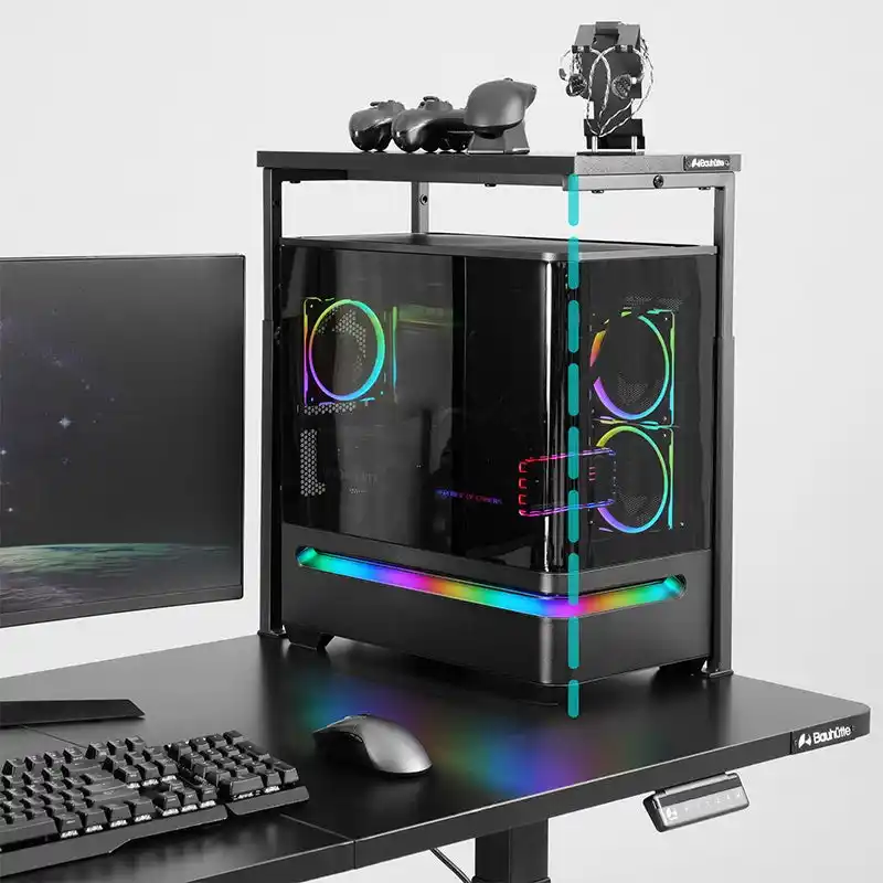 前面の支柱を排除した独自の3本足デザインを採用。こだわりのライティングや内部パーツの輝きを遮りません。耐荷重15kgのタフな仕様で、大型PCに占拠されたデスク面積を垂直方向に拡張し、新たな天板スペースを増築可能です。手前の足がないため、幅や奥行のある筐体にも柔軟に対応します。 |