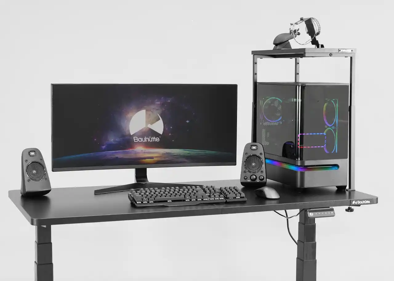 このスペースを便利かつ安全に活用できないかと考え、本製品を開発しました。手前に柱を設けない3本脚仕様で、自慢の筐体やライティングを隠すことなく、デスク面積を垂直方向に拡張。排熱用のスペースもしっかり確保しながら、物置きや展示スペースをスマートに増設できます。 |