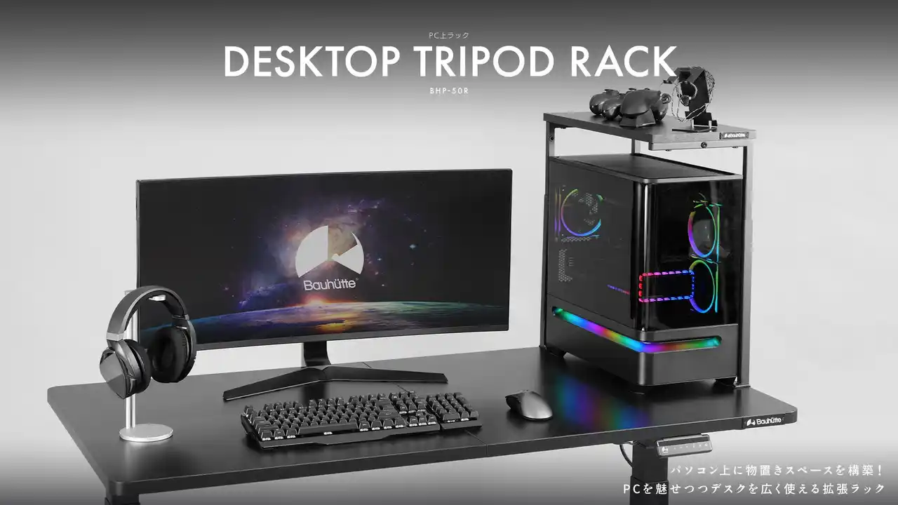 ビーズ株式会社(本社:大阪府東大阪市、代表取締役社長:大上響)が展開するゲーミング家具ブランド「Bauhutte(R)(バウヒュッテ)」は2026年4月、PC上に収納・展示スペースを構築する拡張ラック「PC上ラック BHP-50R」を発売いたします。 |