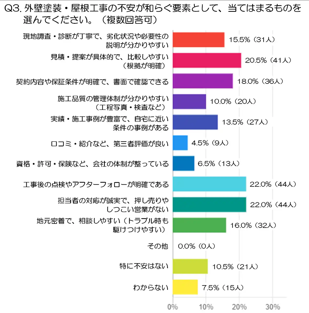 一方で、「工事後にどのくらい長持ちするか不安(耐久性)」は4.5%(9人)にとどまっていますが、これは耐久性への関心が低いというより、まずは契約前の不安のほうが優先されやすいことを示している可能性があります。 |