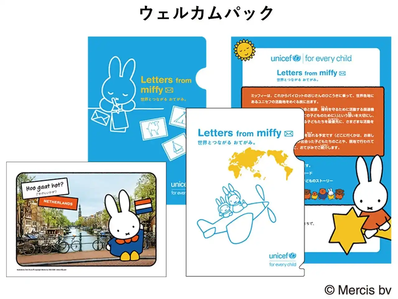 | ミッフィーの作者であるディック・ブルーナさんは、誰かの助けが必要な人たちのために自分が描いたものが役立ったらうれしい、との思いから、これまで世界各国の社会活動に協力してこられました。世界の子どもたちのために行われているユニセフの活動に対しても、例えば、日本ユニセフ協会が過去に頒布していたユニセフ製品へのイラスト使用許可をいただいておりました。このたびの「ユニセフ・マンスリーサポート・プログラム Letters from miffy」においても、世界の子どもたちへの支援の輪を広げるというプログラムの趣旨へのご賛同のもと、イラスト使用の許諾を受け、制作しております。 | |||||||||||||
