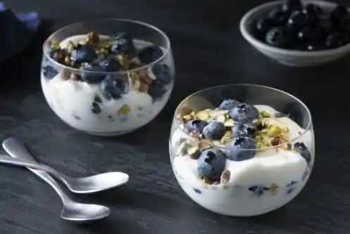 1.ヨーグルト、ブルーベリー、ピスタチオを、2杯のグラスに層のように盛ります。 |