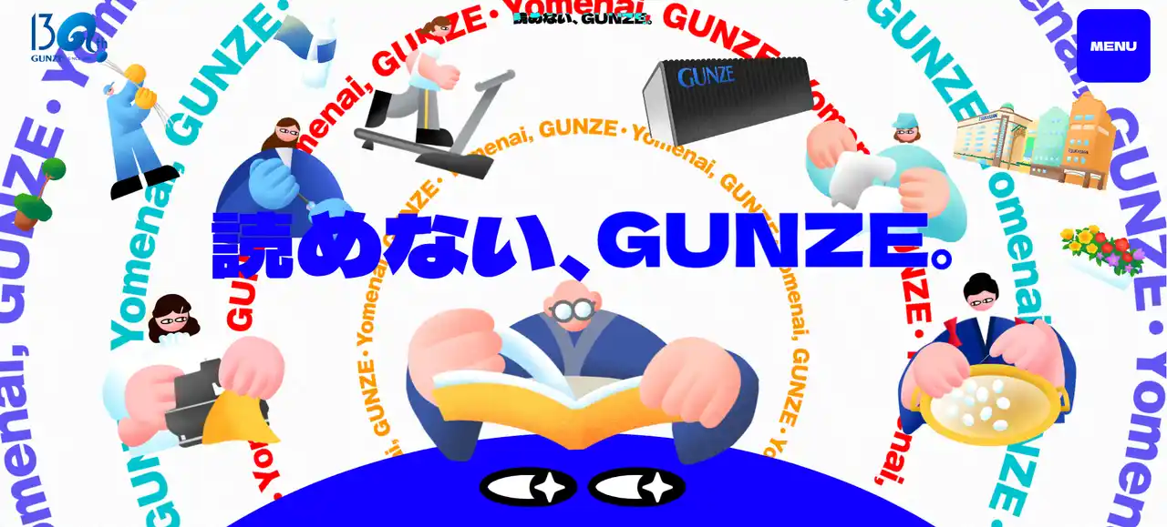 グンゼは創業130周年のプロジェクトとして、主に若年層をターゲットにWebを通じた情報発信を行っています。すべてのコンテンツは、共通してグンゼの社名を若年層が“読めない”という事実をあえて自虐的に捉えつつ、これからも予測がつかない(読めない)進化を遂げていく、という姿勢を「読めない、GUNZE。」と表現しています。 |