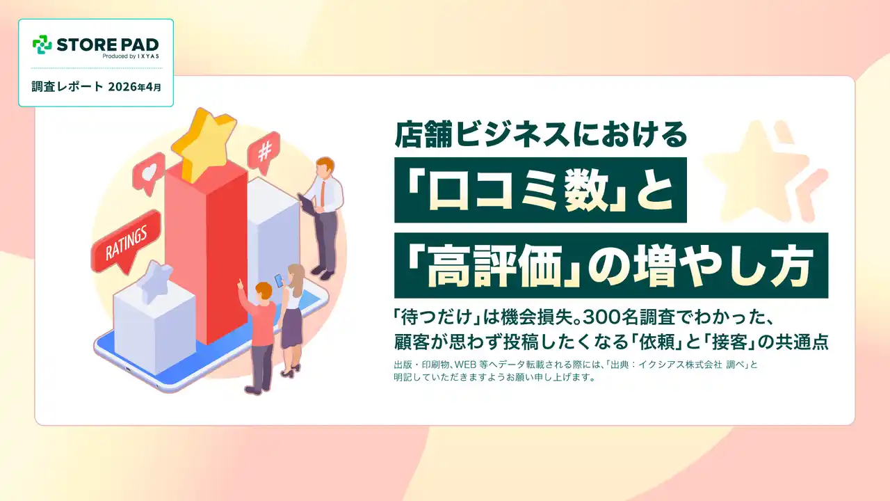 AI搭載型の情報発信・分析プラットフォーム「STOREPAD(ストアパッド)」を提供するイクシアス株式会社(本社:東京都中央区、代表取締役社長 CEO:内藤 崇司)は、一都三県在住の21~59歳の男女を対象に、店舗ビジネスにおける「口コミ投稿に関する実態調査」を実施いたしました。 |