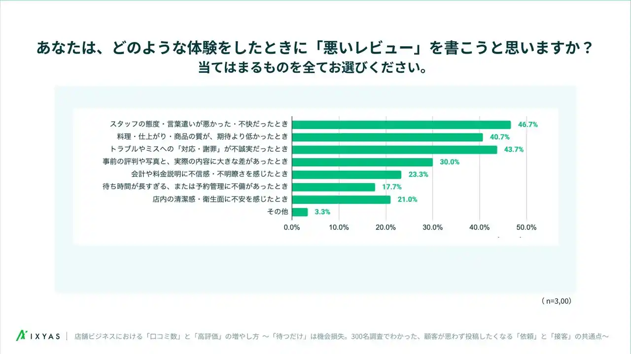 低評価レビューの動機は、「スタッフの態度・言葉遣い」(46.7%)、「トラブルやミスへの対応・謝罪が不誠実」(43.7%)、「料理・仕上がり・商品の質が期待より低かった」(40.7%)が上位3項目となった。 |