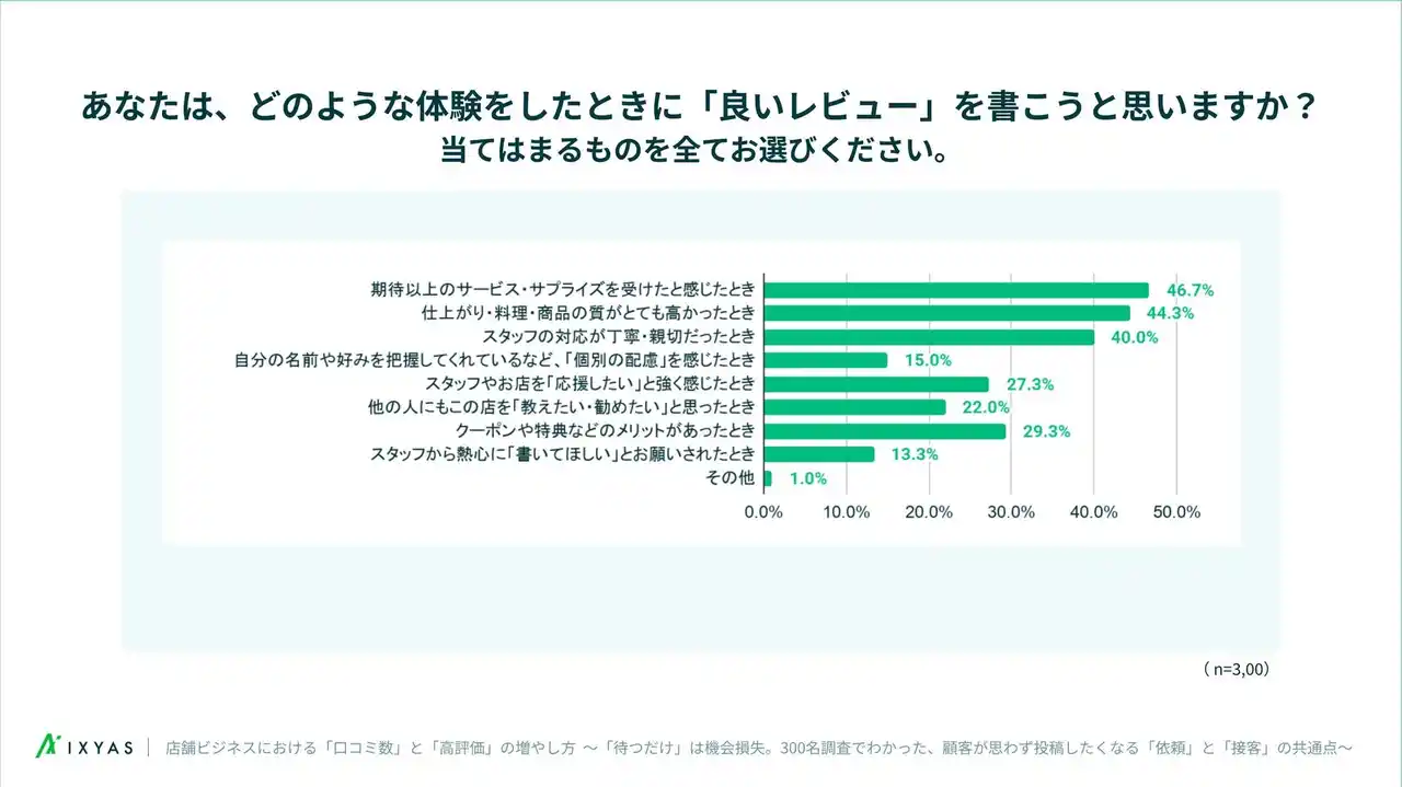 高評価レビューの動機として、「期待以上のサービス・サプライズ」(46.7%)、「仕上がり・料理・商品の質」(44.3%)、「スタッフの対応」(40.0%)が上位3項目となった。一方、「クーポンや特典」(29.3%)や「応援したい気持ち」(27.3%)は二次的な動機にとどまり、「個別の配慮」(15.0%)や「スタッフからの依頼」(13.3%)の割合は相対的に低かった。 一方で、後述の通り“投稿するかどうか”には依頼の仕方が影響する可能性がある。 |