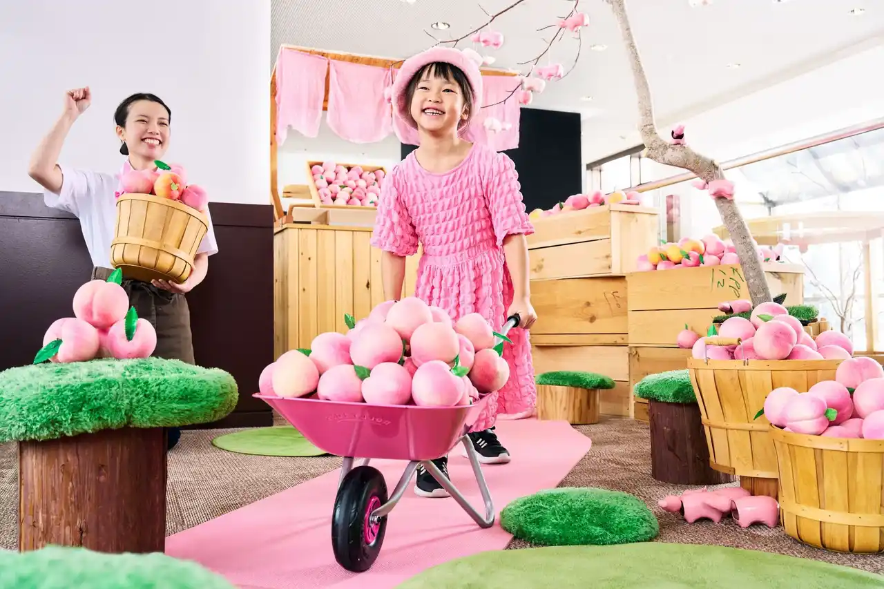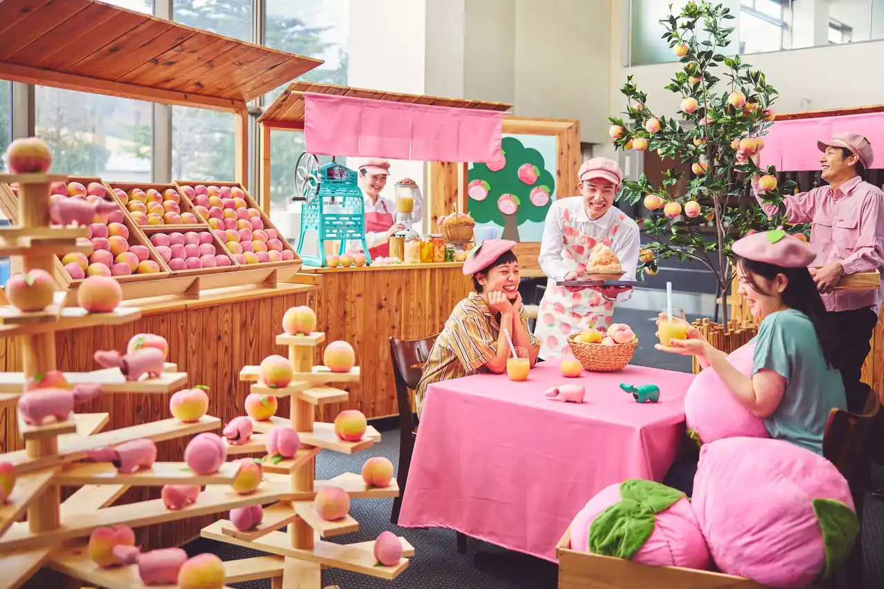 | 本イベントの会場は、桃の木や収穫用の木箱などが置かれ、桃の果樹園をイメージした空間です。桃の果樹園にちなみ、収穫と出荷をそれぞれテーマにした2つのゲームを楽しめます。1つ目は、桃の木に見立てた巨大なボードから桃をハサミで切ると、ボード上をコロコロ落ちてランダムにバケツに落ちる運試しの「コロコロ桃ゲッター」です。2つ目は、桃を手押し車に乗せて障害物を超えながら計測所まで運ぶ、バランスとスピードが試される「ユラユラ桃デリバリー」です。ゲーム参加者には、当イベントオリジナルのグッズをはじめとする景品を贈呈します。お腹だけではなく、目も心も桃でいっぱいになること間違いなしです。 | |||||||||