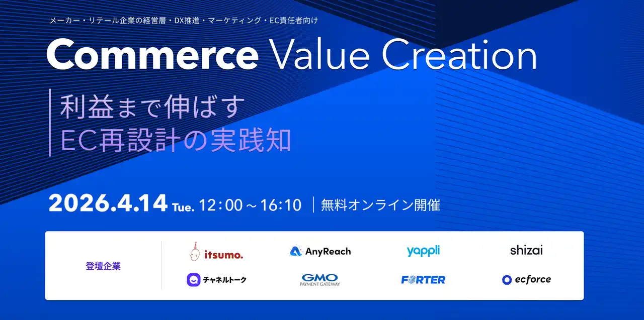 名称:Commerce Value Creation 売上と利益を伸ばすEC戦略の最前線 日時:2026年4月14日(火)12:00~16:10 開催方式:オンライン配信 参加費: 無料(事前登録制) 共催:株式会社SUPER STUDIO、株式会社いつも、AnyReach株式会社、株式会社Channel Corporation、株式会社ヤプリ、株式会社 shizai、GMOペイメントゲートウェイ株式会社、Forter, Inc 対象者:メーカー・リテール企業の経営層・DX推進・マーケティング・EC責任者など 注意事項: ・セッションテーマ、登壇者は予告なく変更となる場合がございます。 ・講演内容の録画、録音はご遠慮ください。 お問合わせ: Tel 03-5759-6380 Email seminar@super-studio.jp 受付 11:00~18:00(土日祝日除く) |