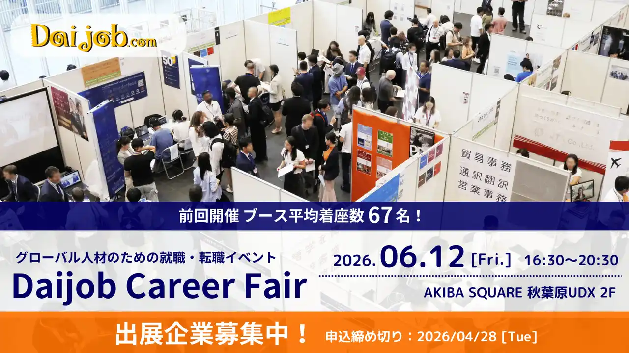 ビジネス・プロフェッショナル×バイリンガルのための転職・求人情報サイト「Daijob.com」を展開するヒューマングローバルタレント株式会社(本社:東京都新宿区、代表取締役:横川 友樹、以下「当社」)は、グローバル人材特化の対面型転職イベント「第60回Daijob Career Fair」を、2026年6月12日(金)にAKIBA SQUARE(東京都:秋葉原)で開催するにあたり、本日より出展企業の募集を開始します。 |