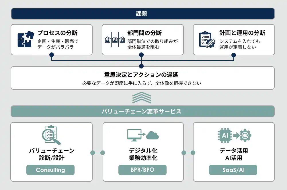 こうした状況ではバリューチェーン全体を俯瞰したデータが把握できず、迅速な意思決定や全社的な需要予測といった全体最適が進みません。 |