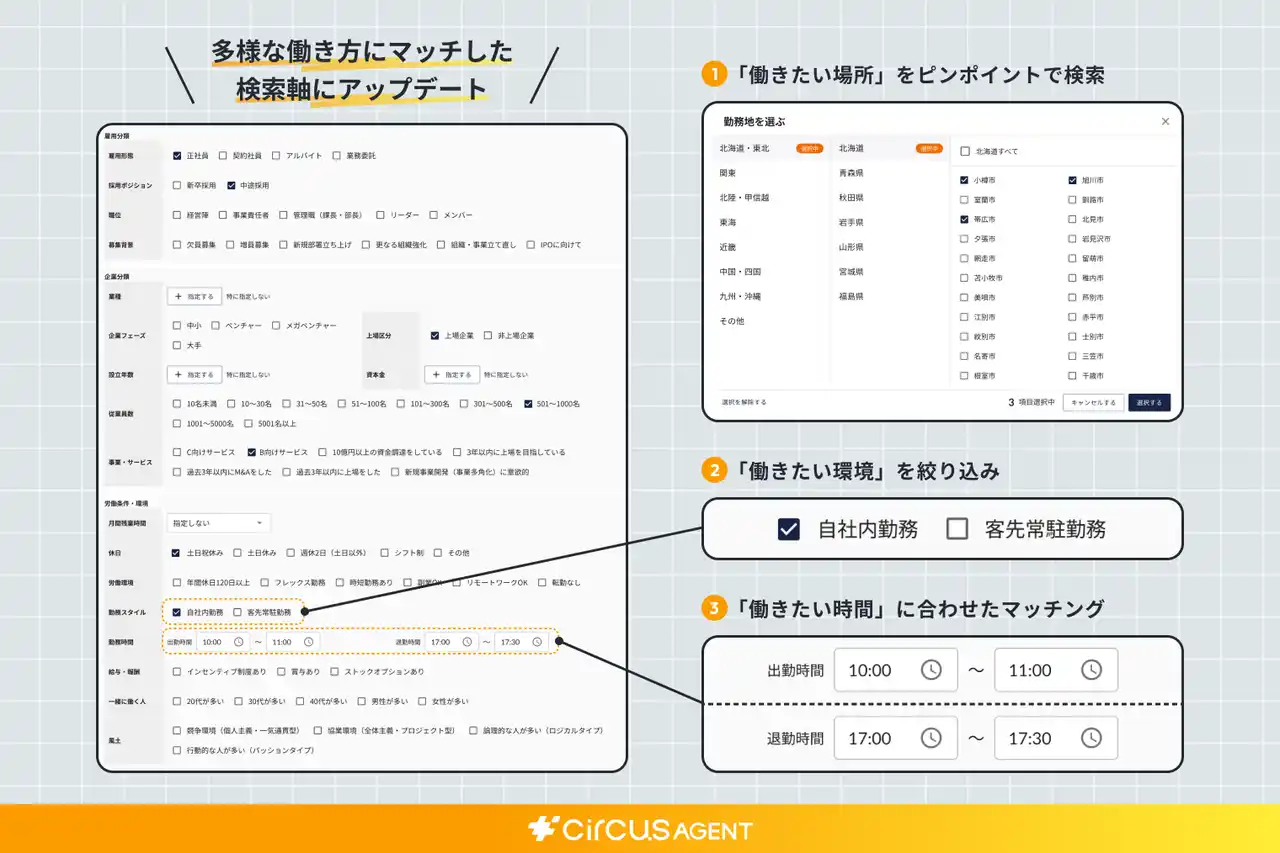 「circusAGENT」では、これまでも多角的な求人検索軸を備えてまいりましたが、多様化するワークスタイルに対応できるよう、求人検索機能のアップデートを行いました。細部まで絞り込める検索機能の実装により、エージェントは求人検索の工数を最小限に抑えながら、求職者のこだわりを汲み取った質の高い提案をスピーディーに行うことが可能となります。 |