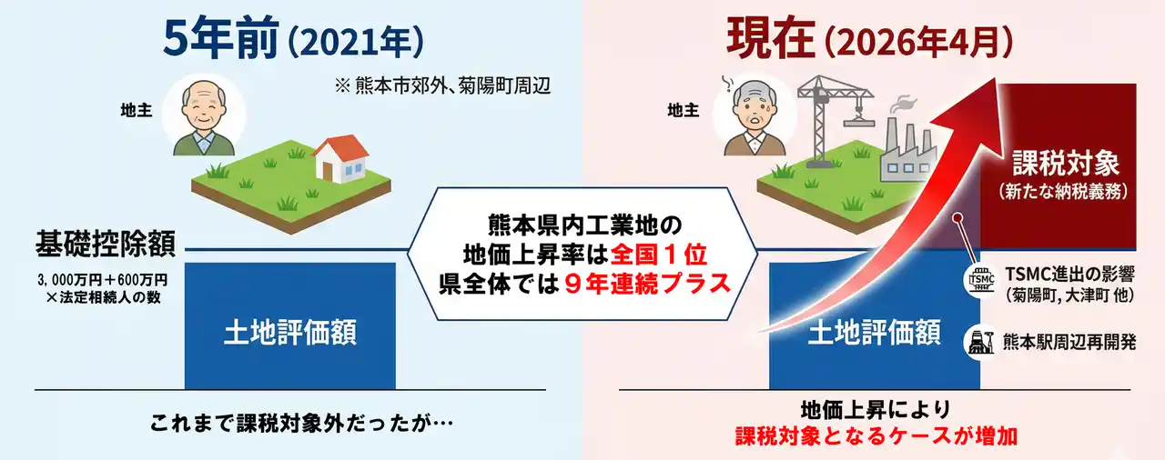 世界的な半導体企業・TSMCの進出等により、地価上昇率で全国上位を独占する熊本県。その恩恵の裏側で、「いつの間にか課税対象となった層」の増加や、今年4月に開始した相続登記の義務化などにより、地主や経営者層における適正な資産承継に向けた見直しが急務となっています。 |