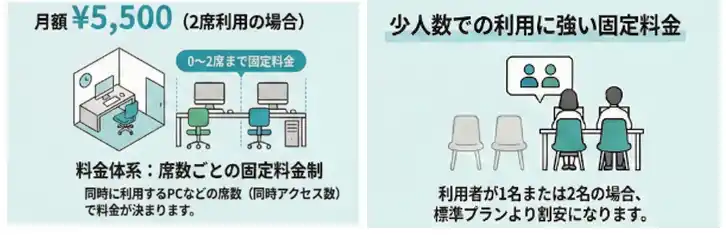 月額利用料は 1~2席:5,500円(税込)~ と、通信制高校・サポート校・就労継続支援施設の運営実態に配慮した設計となっています。 |