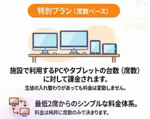 本プランでは、料金の基準を利用ユーザー数ではなく、同時に利用する人数=席数としています。これにより、通信制高校・サポート校や就労継続支援施設の多様な運営形態に柔軟に対応し、必要最小限のコストで利用開始・継続が可能です。 |
