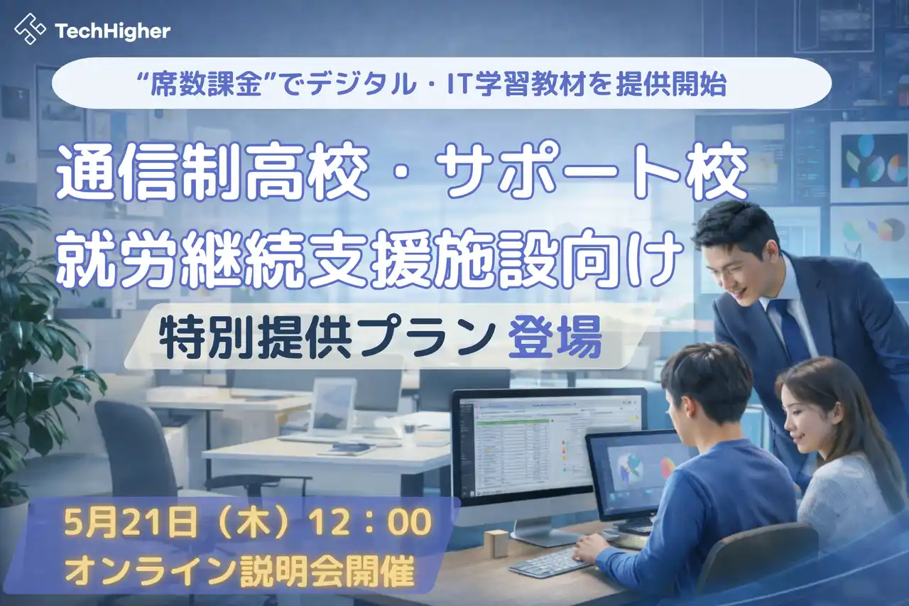 10代向けデジタル人材育成サービス「TechHigher」を運営する株式会社エクシード(本社:東京都渋谷区、代表取締役:澤部愛子)は、通信制高校・サポート校および就労継続支援施設向けに、運営実態に合わせて設計した「デジタル・IT学習教材 特別提供プラン」を2026年4月より提供開始します。 |