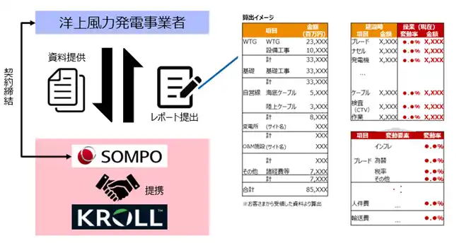 | 算定にあたっては、インフレ指数、国際的な設備単価データ、為替動向、税制の変化などを反映し、現在の市場環境を踏まえた評価を行います。グローバルで洋上風力発電所の評価実績を有するKROLL※と提携し、その知見と損保ジャパンおよびSOMPOリスクの専門性を組み合わせることで、信頼性の高い評価を実現します。 | |||
