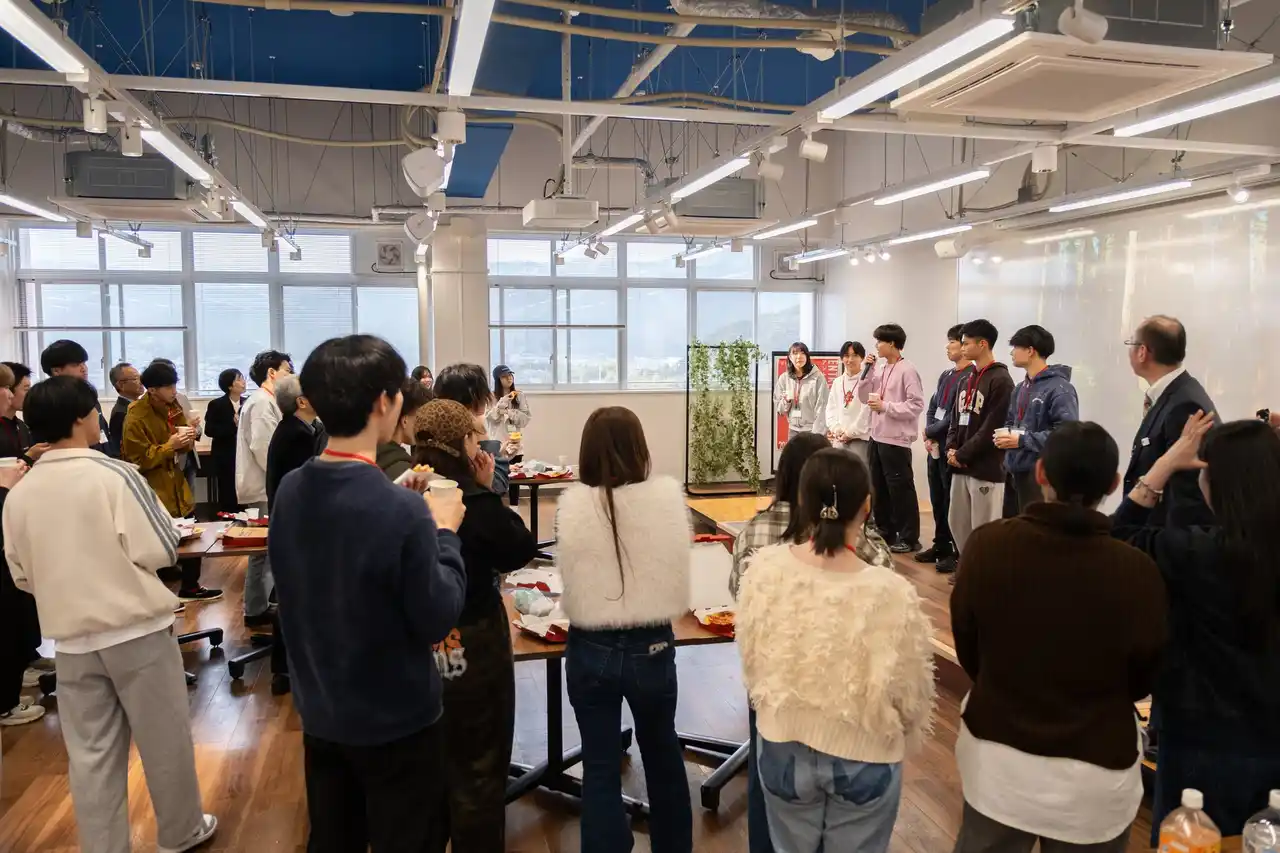 オリエンテーション後の交流会では、在間学長から第1期生へ激励の言葉が贈られました。さらに、これまで学環の立ち上げに関わってきた教員や、アントレプレナー育成プログラムで学んできた先輩学生たちも駆けつけ、新入生たちを迎えました。次第に緊張の空気がほどけ、笑顔が連鎖していきます。ここで出会った仲間や先輩、教職員とのつながりが、これからの挑戦を支える最初のネットワークになっていきます。 |