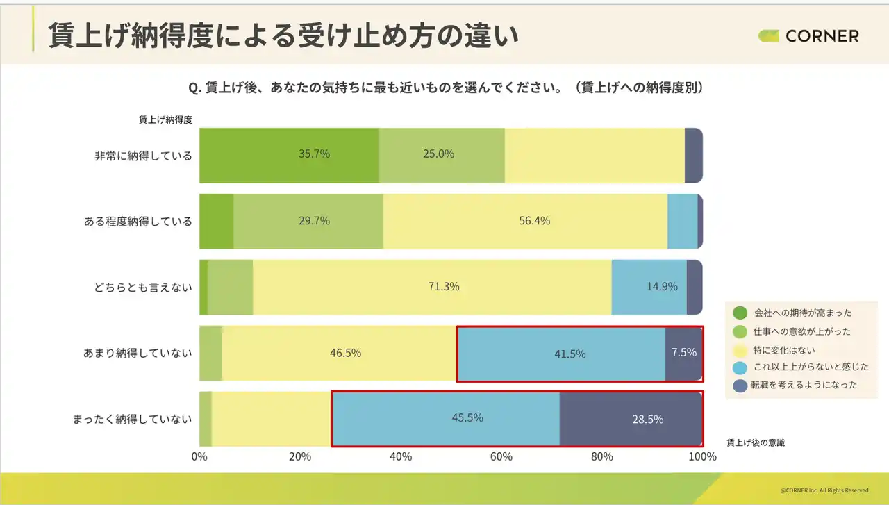 賃上げに対する納得度別に意識変化を比較したところ、納得していない層では「これ以上上がらない」と感じる割合が高く、転職を考える割合も高い水準にあった。 |