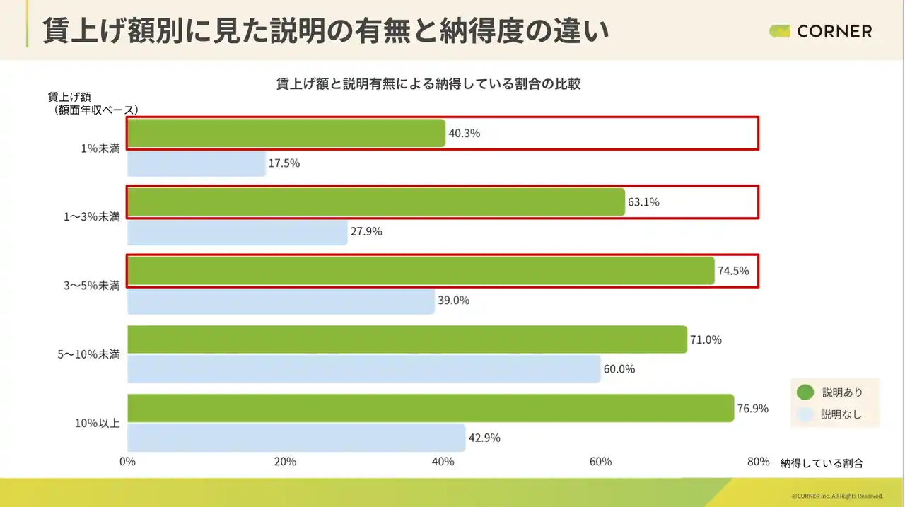 賃上げ額別に納得度を分析したところ、同程度の賃上げ幅でも、説明の有無によって納得度に差が見られた。説明があった場合には満足度が高く、説明がなかった場合には不満の割合が高い傾向が確認されている。賃上げは金額のみで評価されているわけではないことが示されている。 |