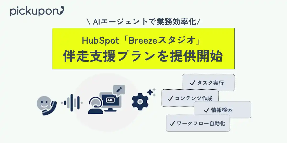 AIクラウドIP電話サービスの提供などを通じて企業の営業DXを推進するpickupon株式会社(本社:千葉県市川市、代表取締役:小幡洋一)は、HubSpotが提供するAI機能群「Breeze」の中核である「Breezeスタジオ」を活用し、企業の業務設計から運用改善までを支援する「Breezeスタジオ伴走支援プラン」の提供を開始しました。 |