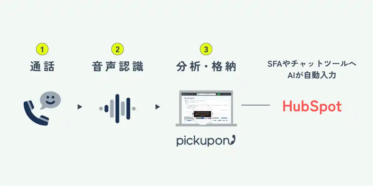 当社の最大の強みは、会話サマリーAI電話「pickupon(ピクポン)」を通じて、顧客の本音や温度感を含む「通話・商談の一次情報」をHubSpotのコンテキストとして自動連携できる点にあります。 |