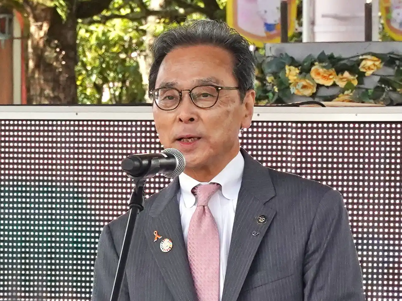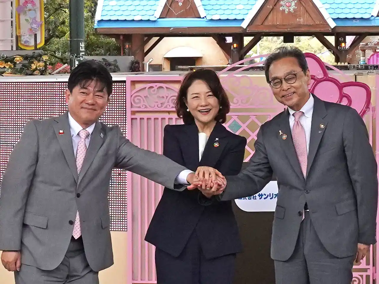 三者代表からのコメントとして、杵築市永松市長は「年齢やハンディキャップを問わずハーモニーランドを楽しめるよう、日々進化するハーモニーランドに期待している」、日出町安部町長は「杵築市と日出町が協力し、多くの企業、関係者のみなさまの力を借りながら、全力でエンタメリゾート化に取り組んでまいります。」と語りました。さらに、サンリオエンターテイメント代表取締役社長小巻亜矢は、「フレンドシップ宣言セレモニーは『みんななかよく』の思いを持ってくださっている杵築市と日出町のご協力があったから実現できた。