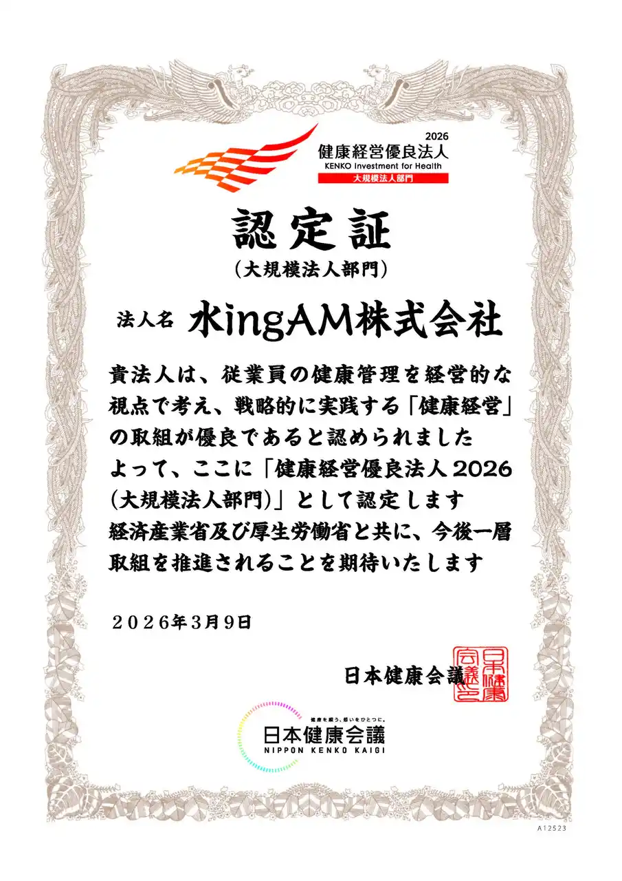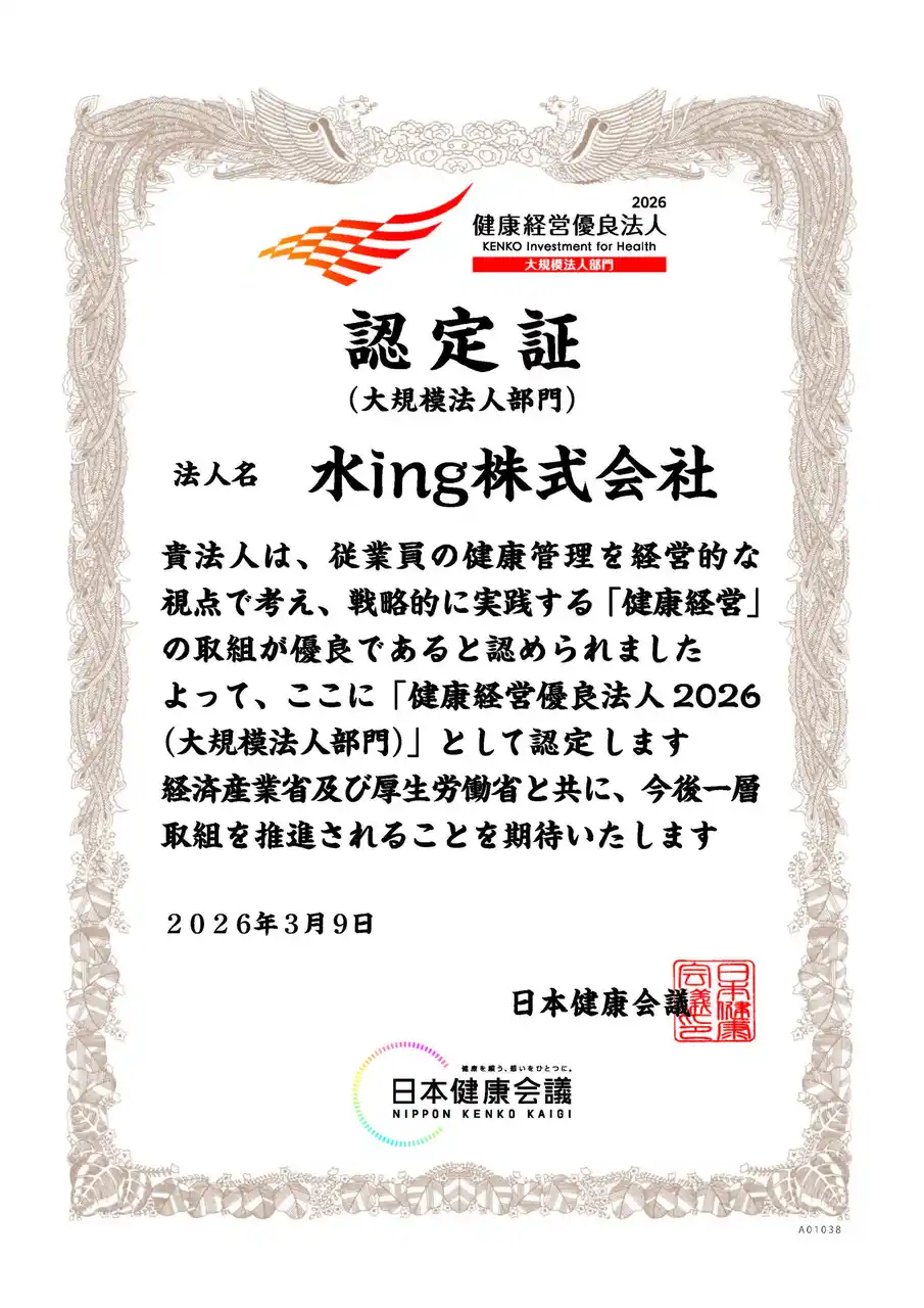 水ing株式会社(社長︓安田真規、本社︓東京都港区)は、2026年3月9日、経済産業省と日本健康会議が共同で実施する「健康経営優良法人認定制度」において、「健康経営優良法人2026(大規模法人部門)」に認定されたことをお知らせします。 |