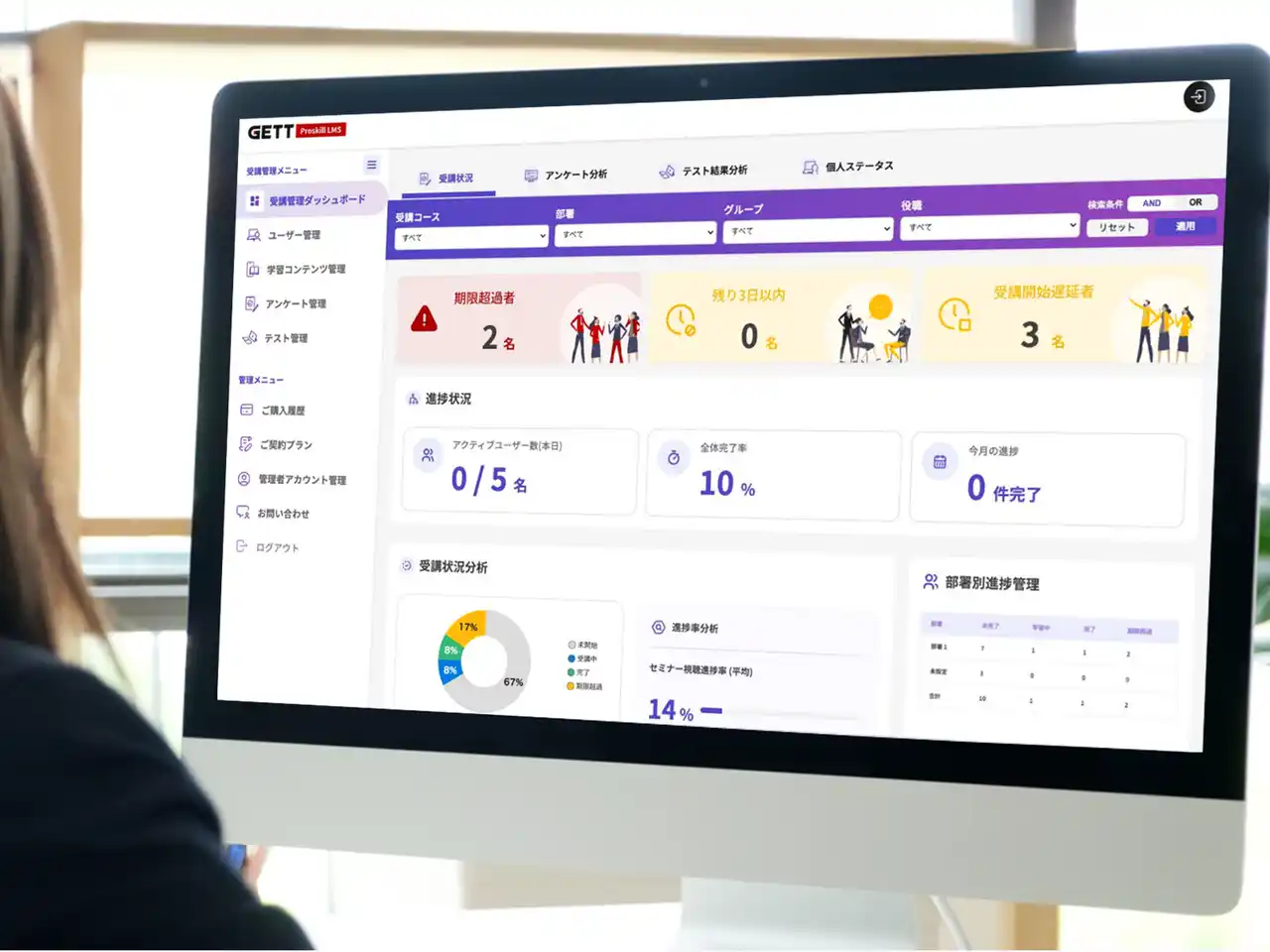 教育管理システム「GETT Proskill LMS」により、進捗や学習履歴を可視化し、教材管理も一元化できます。管理・学習の双方を効率化します。 |