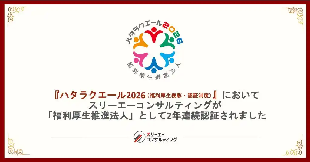 Pマーク、 ISOコンサルにおける支援実績 No.1(注1)のISO/Pマークの取得・運用支援サービス「認証パートナー」を提供する株式会社スリーエーコンサルティング(本社:大阪府大阪市、代表取締役社長:竹嶋 寛人)は、福利厚生の充実・活用に取り組む法人を認証する「ハタラクエール2026」において、「福利厚生推進法人」として認証されました。今後も、スリーエーコンサルティングは従業員や関わってくださる方が、自信、志を持って、笑顔でいきいきと働きやすい環境をつくり、会社の成長へと繋げてまいります。 |