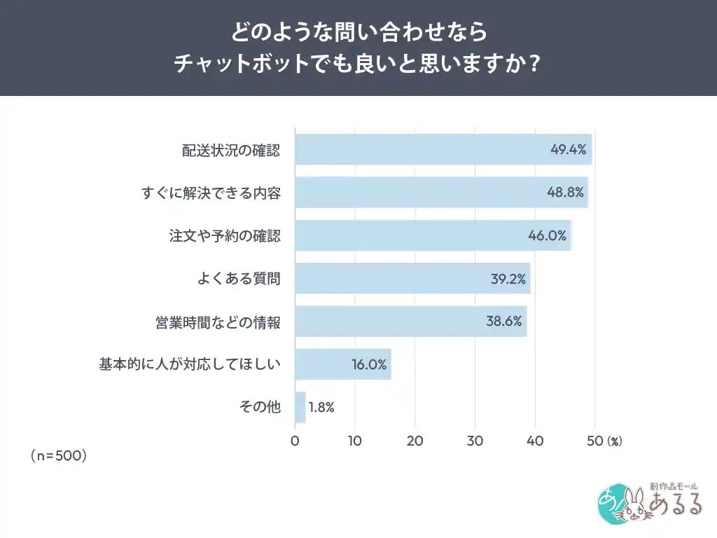 | また、「人に問い合わせできない」といった不満も一定数見られており、チャットボット単体での対応に加え人対応へ適切につながる導線設計の重要性も示唆されます。 | |||
