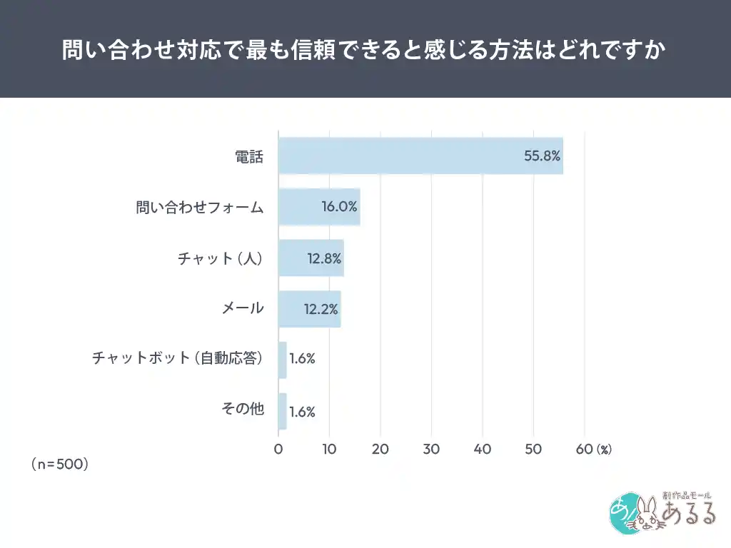 問い合わせ対応で最も信頼できると感じる方法としては、「電話」が55.8%で最多となりました。 チャットボットやメールなどと比較して、直接的なコミュニケーションへの信頼が高い傾向が見られます。 |