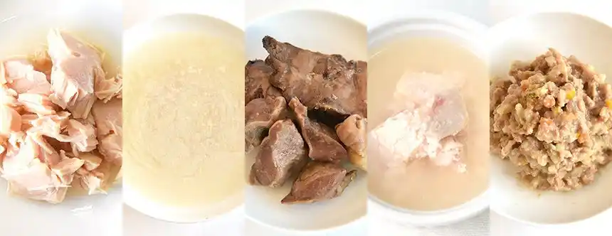 種類が豊富で好きな犬も多いチキンを使ったトッピング5種を集めました。チキンといってもササミをカットしたもの、ゴロっとした肉感の強いタイプ、水分補給としても使いやすいスープタイプなど、バラエティに富んだセット内容となっています。通常価格2,268円から21.0%オフの1,790円でのご提供です。 |