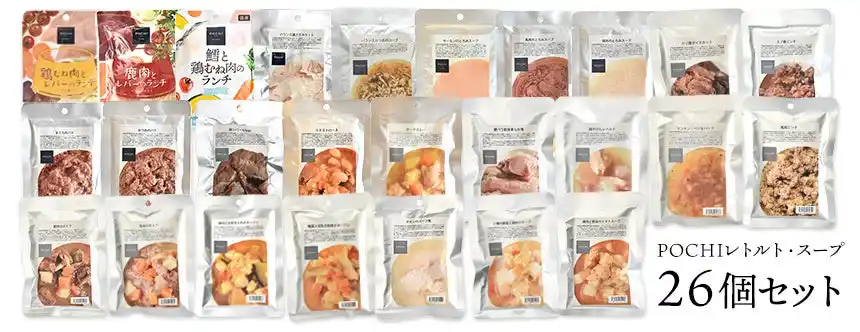 POCHIのトッピングフレンドリーレトルトが26種類入った「オールトッピングセット」。お肉が存分に楽しめるものから、具だくさんのもの、食べやすいスープ系まで、バラエティに豊んだラインナップがそろいます。通常価格11,702円から28.3%オフの8,390円でのご提供です。 |