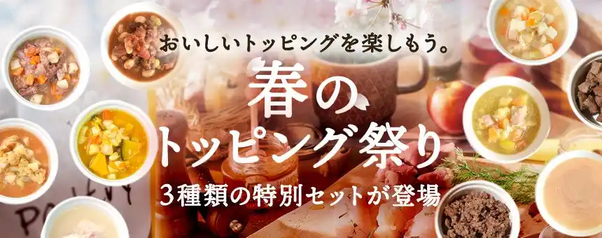 プレミアムドッグフードメーカー「POCHI」(運営:マーケティングパートナー株式会社、本社所在地:東京都新宿区、代表取締役社長:泰地正人、Tel:03-6772-8194、https://www.pochi.co.jp/)は、犬たちの食事に新たな楽しみを加えるきっかけになることを目指し、POCHI自慢のレトルト商品のセットを特別価格で販売する「春のトッピング祭り」を4月7日(火)より開始します。 |
