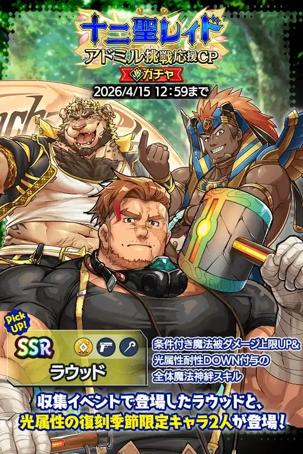 さらに、「HAPPY イースター♪フェスティバル」で登場した「ラウッド」に加え、光属性の復刻季節限定キャラクター2体が登場する十二聖レイド「アドミル」挑戦応援キャンペーンガチャも開催! |