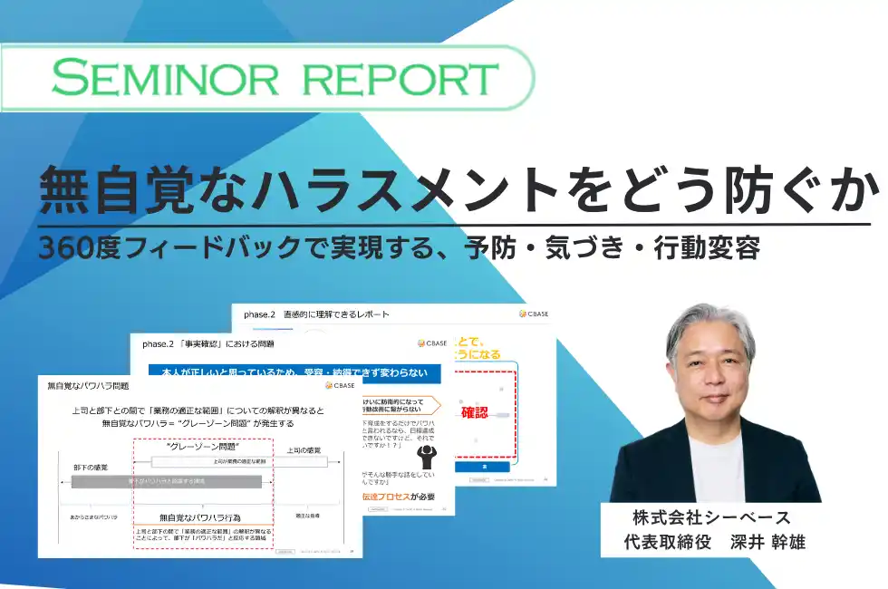 「フィードバックと対話で、すべての人と組織、社会をアップデートする」をミッションに掲げるHRサーベイクラウドサービスの株式会社シーベース(本社所在地:東京都新宿区、代表取締役社長:深井幹雄)は、2026年3月に開催した「無自覚なハラスメントをどう防ぐか~360度フィードバックで実現する、予防・気づき・行動変容のハラスメント対策~」の開催レポートを公開しましたので、お知らせいたします。 |