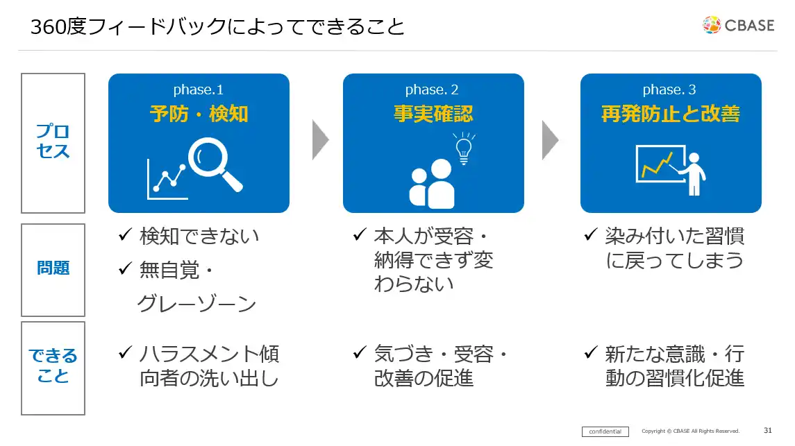 課題に対し、360度フィードバックを活用したハラスメント対策を解説しました。360度フィードバックは能力評価のための仕組みではなく「仕事中の自分を知る鏡」であり、「日常の行動の癖を可視化するもの」です。 |
