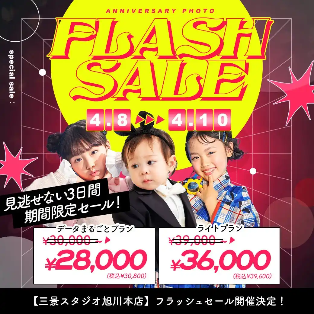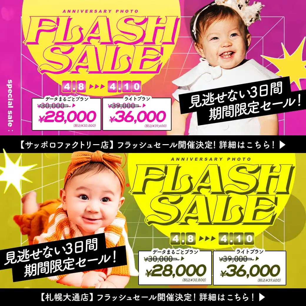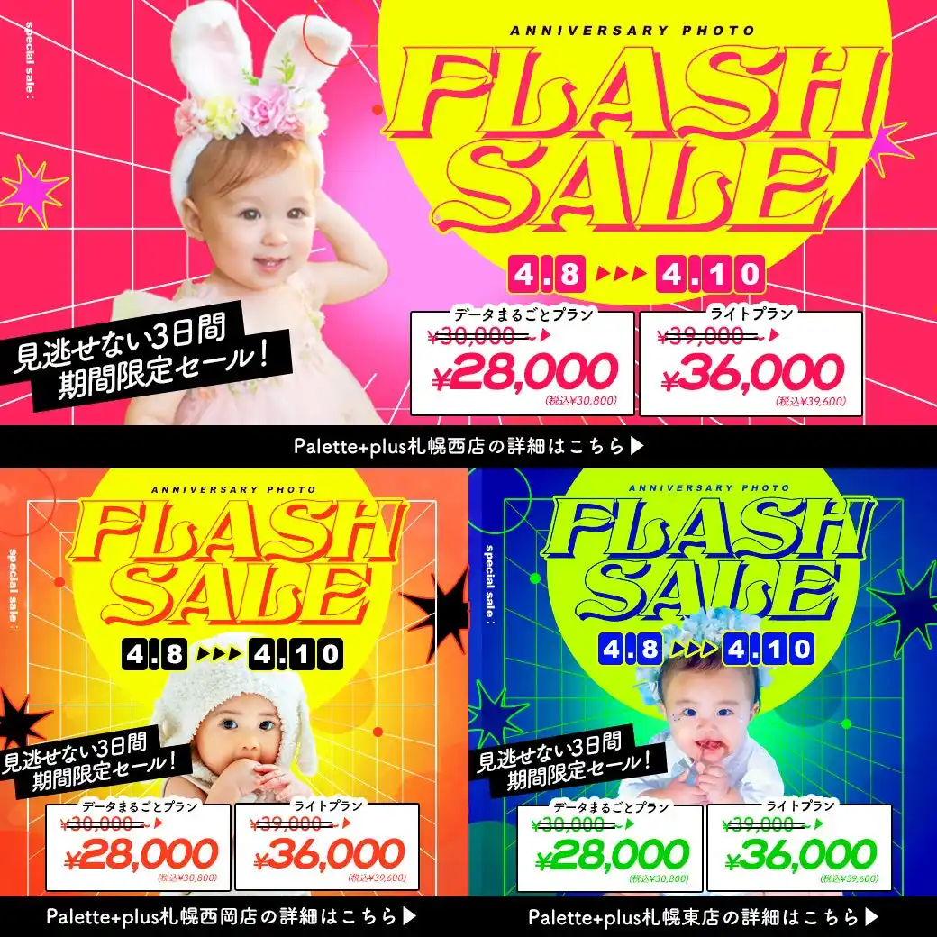 北海道全域に店舗を構える写真工房ぱれっと(本社/有限会社三景スタジオ)。百日記念、ハーフバースデー、1歳お誕生日、七五三記念、入学&卒園記念まで幅広く撮影をしている、写真工房ぱれっと、Palette+plus、三景スタジオにて4月、3日間限定のフラッシュセールを実施中。 |