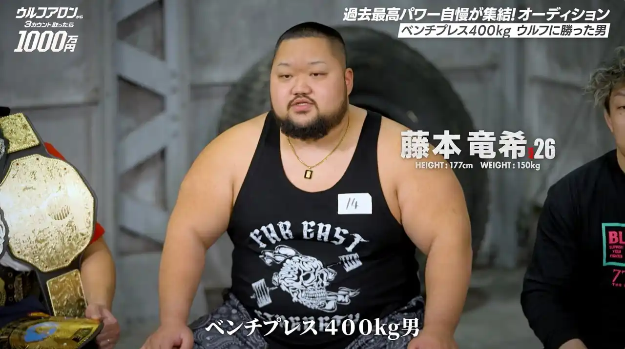 一際大きな体格で会場の視線を集めたのは「ベンチプレス400kg男」と名乗る藤本竜希。100kgのベンチプレスと軽々と上げるパフォーマンスを披露し、周囲を驚かせると「アジアで唯一ベンチプレス400kgを上げる」と自信をのぞかせます。さらに2025年の大晦日特番にて、壁を押し合う競技「パワーウォール」でウルフアロンと対戦し、実際に勝利を収めた実績も。「ウルフに勝った男」として一目置かれる存在感を発揮しました。 |