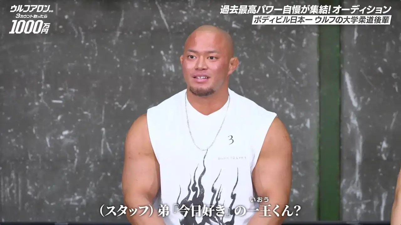 中でも注目されたのは、「ボディビル日本一」に2度輝いた実績を誇り、ウルフアロンと同じ東海大学柔道部の後輩だと語る榎田大人。柔道でも「全国団体戦2位・3位」「国体代表」などの輝かしい成績を持ち、パワーと技術を兼ね備えた榎田は、弟が「ABEMA」の人気恋愛リアリティーショー『今日、好きになりました。』に出演していたいおう(榎田一王)だということも明かし、「(弟と)共演できたらいいねと話した」と語りました。 |