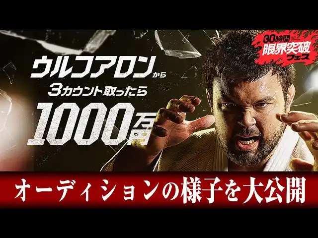 新しい未来のテレビ「ABEMA(アベマ)」は、2026年4月11日(土)に開局10周年を迎えます。そして「ABEMA」10周年を記念し、4月11日(土)午後3時から12日(日)夜10時にわたり、特別番組『30時間限界突破フェス』を生放送。本番組の目玉企画として、「1000万円シリーズ」の最新作となる『ウルフアロンから3カウント取ったら1000万円』放送いたします。このたび、「ABEMA格闘」公式YouTubeチャンネルにて、本企画の挑戦者を選考するオーディションの模様を公開いたしました。 |