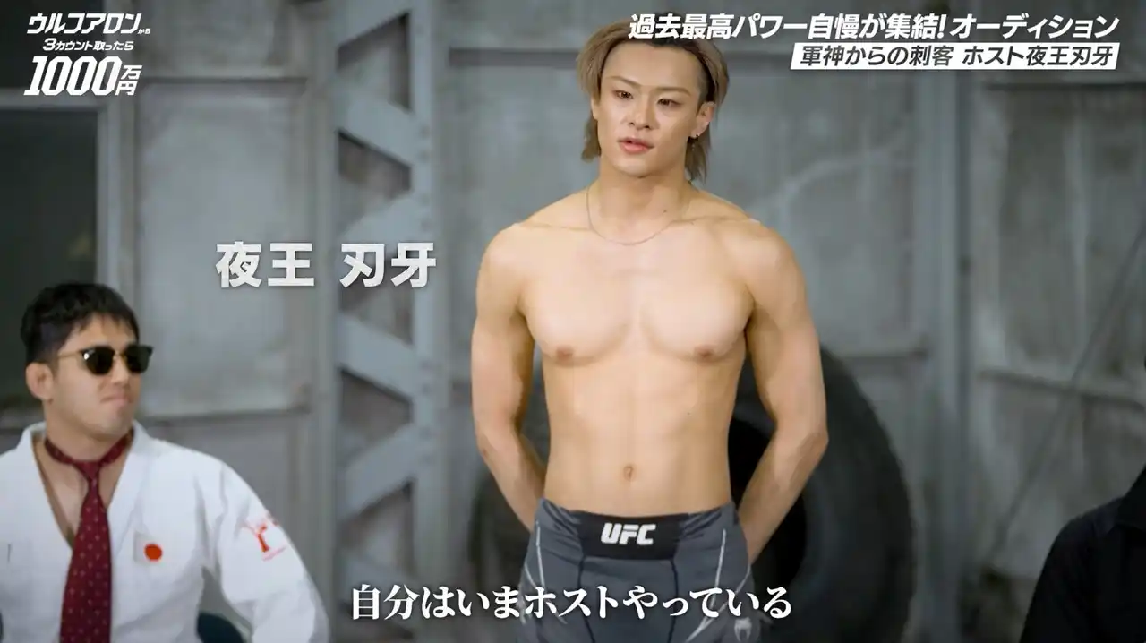 また、「ABEMA」オリジナルバラエティ『愛のハイエナ』シリーズ出演でもお馴染みのホスト界のカリスマ、軍神(心湊一希)の弟子として、ホスト・夜王 刃牙も参加。見た目の華やかさとは裏腹に、格闘技イベント『RISE』への出場経験や、アマチュアMMAの『パンクラス』『DEEP』全日本大会に出場した確かな実力を持ち、「ウルフアロンを倒してホスト業界を盛り上げたい」と野心を見せつけました。 |